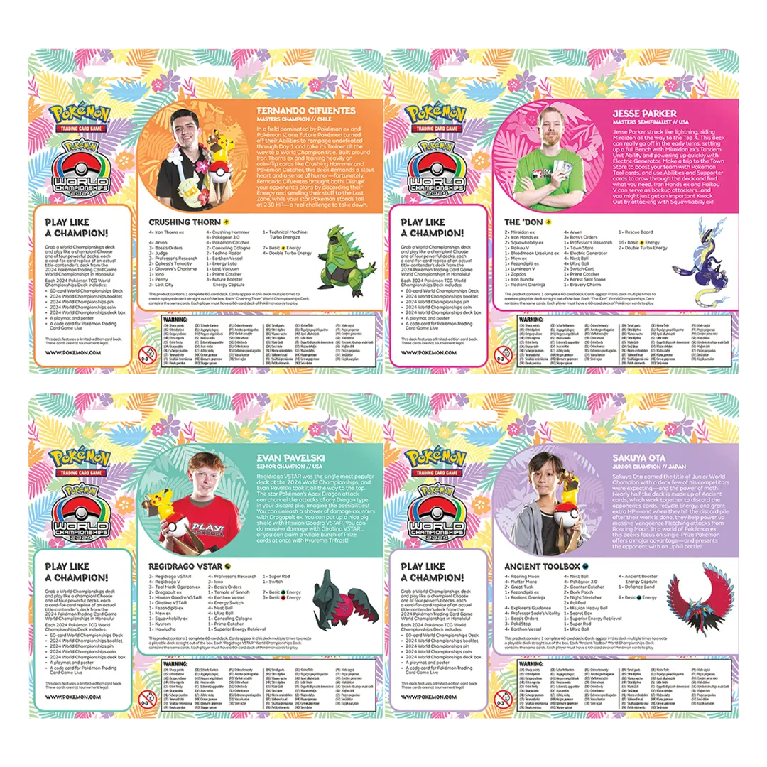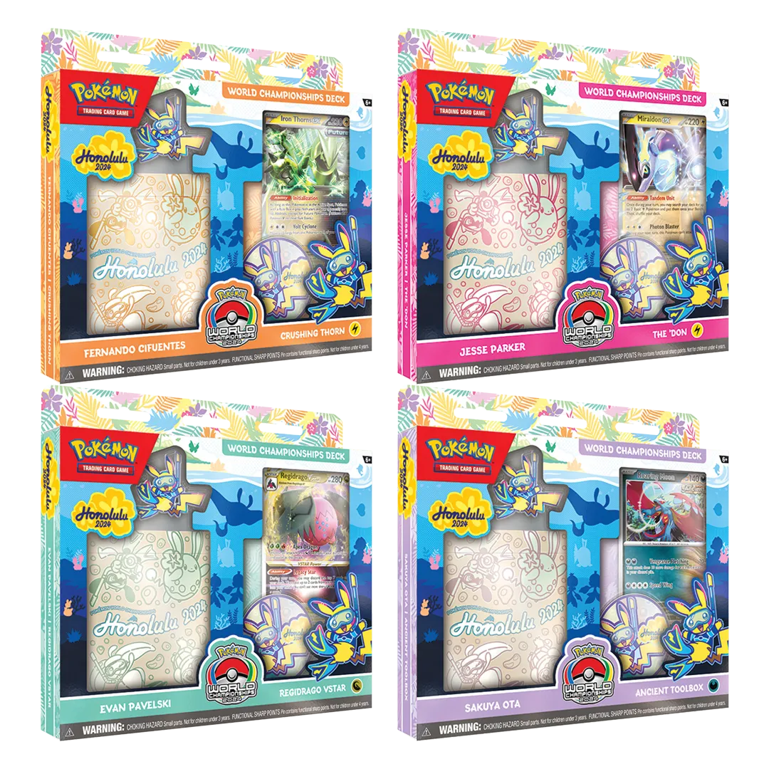 Grab a World Championships deck and play like a champion! Choose one of four powerful decks, each a card-for-card replica of an actual title-contender’s deck from the 2024 Pokémon Trading Card Game World Championships in Honolulu!