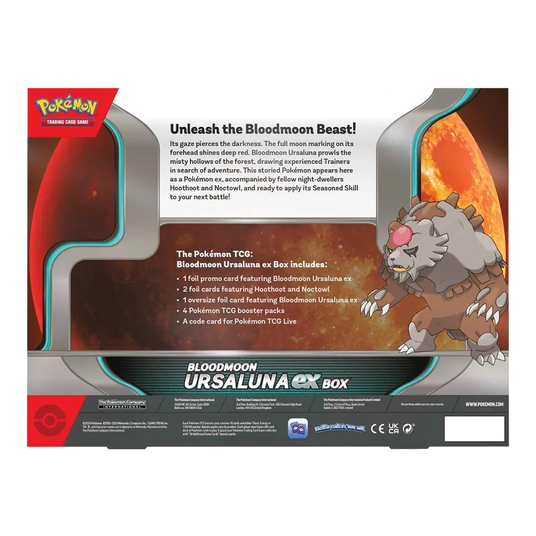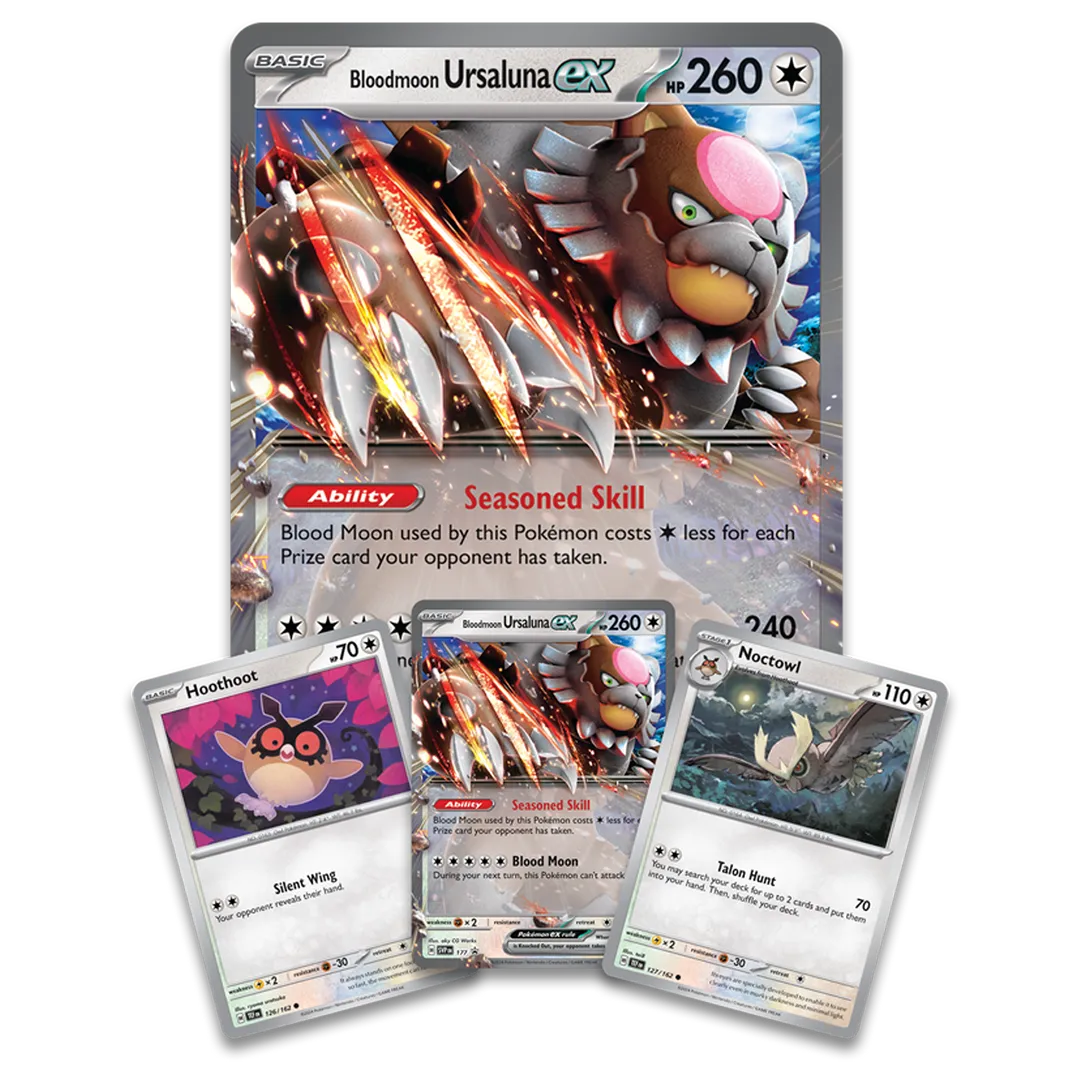 Its gaze pierces the darkness. The full moon marking on its forehead shines deep red. Bloodmoon Ursaluna prowls the misty hollows of the forest, drawing experienced Trainers in search of adventure. This storied Pok mon appears here as a Pok mon ex, accompanied by fellow night-dwellers Hoothoot and Noctowl, and ready to apply its Seasoned Skill to your next battle!