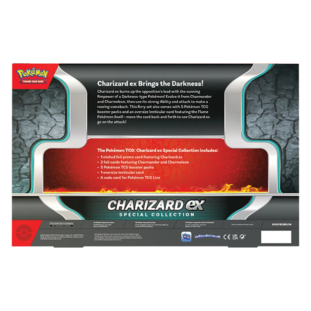 Charizard ex burns up the opposition’s lead with the cunning firepower of a Darkness-type Pok mon! Evolve it from Charmander and Charmeleon, then use its strong Ability and attack to make a roaring comeback. This fiery set also comes with 5 Pok mon TCG booster packs and an oversize lenticular card featuring the Flame Pok mon itself—move the card back and forth to see Charizard ex go on the attack!