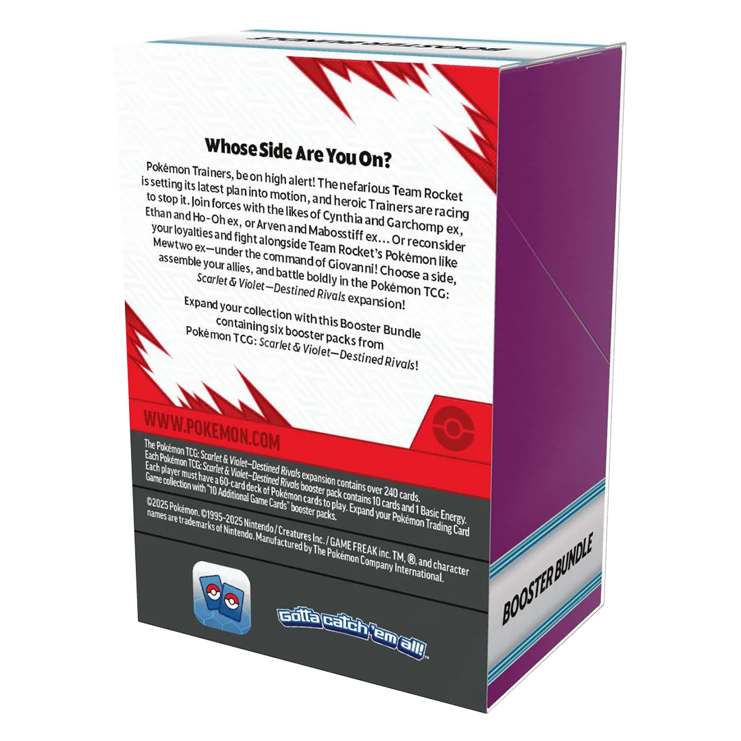 Whose Side Are You On? Pok mon Trainers, be on high alert! The nefarious Team Rocket is setting its latest plan into motion, and heroic Trainers are racing to stop it. Join forces with the likes of Cynthia and Garchomp ex, Ethan and Ho-Oh ex, or Arven and Mabosstiff ex… Or reconsider your loyalties and fight alongside Team Rocket’s Pok mon like Mewtwo ex—under the command of Giovanni! Choose a side, assemble your allies, and battle boldly in the Pok mon TCG: Scarlet & Violet—Destined Rivals expansion!