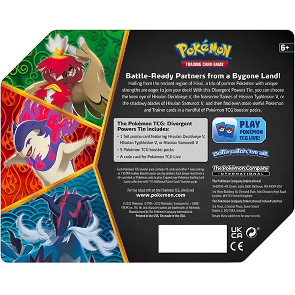 Hailing from the ancient region of Hisui, a trio of partner Pokémon with unique strengths are eager to join your deck! With this Divergent Powers Tin, you can choose the keen eye of Hisuian Decidueye V, the fearsome flames of Hisuian Typhlosion V, or the shadowy blades of Hisuian Samurott V, and then find even more useful Pokémon and Trainer cards in a handful of Pokémon TCG booster packs.