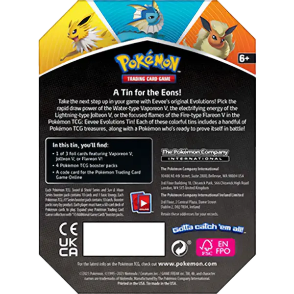 A Tin for the Eons! Take the next step up in your game with Eevee’s original Evolutions! This colorful tin includes a handful of Pokémon TCG treasures, along with a Pokémon who’s ready to prove itself in battle!