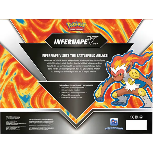 Blaze a new trail in battle with the agility and power of Infernape V! Keep the coins flipping with its Meteor Punch attack, then burn down the battlefield with a massive Bright Flame! In this box, you’ll find playable and oversize versions of Infernape V, plus a bonus playable card featuring Empoleon. You’ll also get a handful of Pokémon TCG booster packs to enhance your decks and fill out your collection.