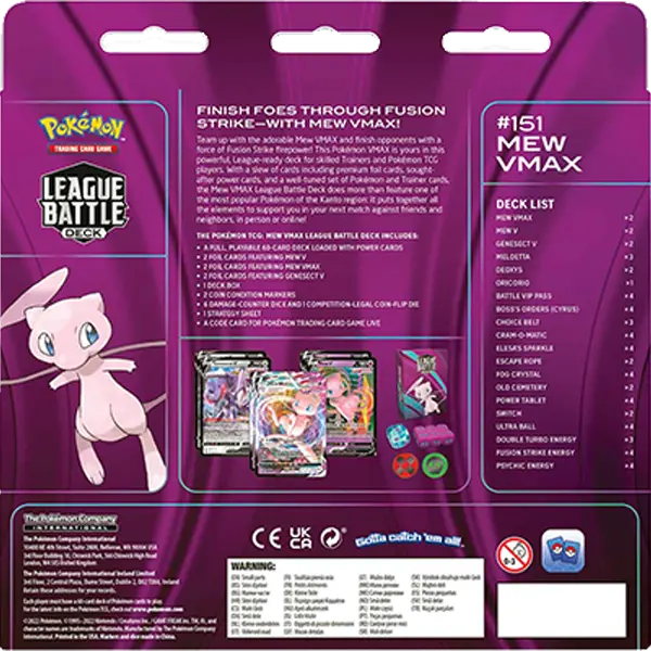 Team up with the adorable Mew VMAX and finish opponents with a force of Fusion Strike firepower! This Pokémon VMAX is yours in this powerful, League-ready deck for skilled Trainers and Pokémon TCG players. With a slew of cards including premium foil cards, sought-after power cards, and a well-tuned set of Pokémon and Trainer cards, the Mew VMAX League Battle Deck does more than feature one of the most popular Pokémon of the Kanto region: it puts together all the elements to support you in your next match against friends and neighbors, in person or online!