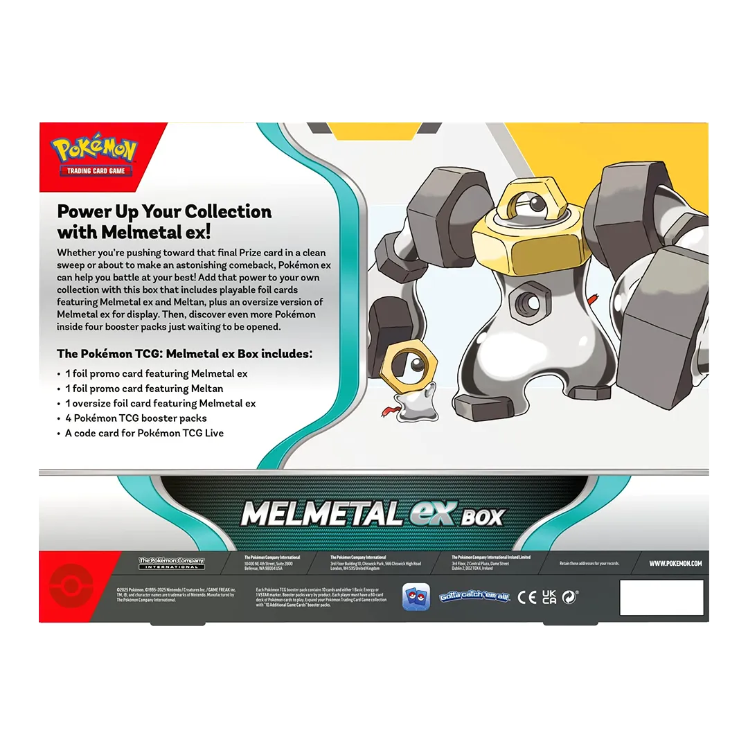 Whether you’re pushing toward that final Prize card in a clean sweep or about to make an astonishing comeback, Pokémon ex can help you battle at your best! Add that power to your own collection with this box that includes playable foil cards featuring Melmetal ex and Meltan, plus an oversize version of Melmetal ex for display. Then, discover even more Pokémon inside four booster packs just waiting to be opened.