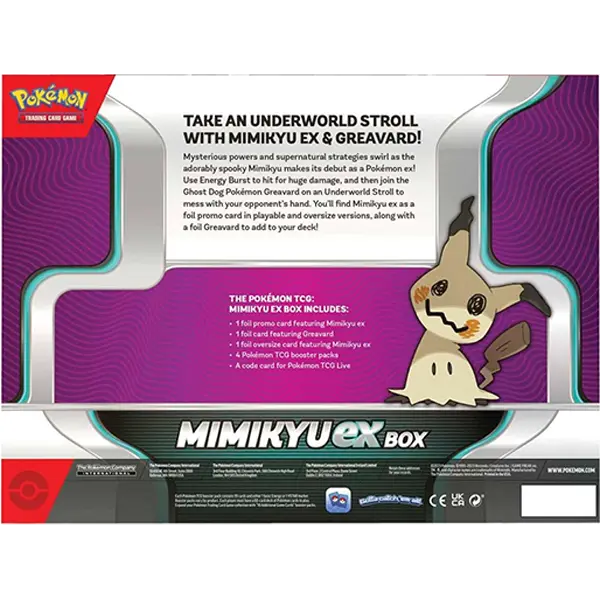 Mysterious powers and supernatural strategies swirl as the adorably spooky Mimikyu makes its debut as a Pokémon ex! Use Energy Burst to hit for huge damage, and then join the Ghost Dog Pokémon Greavard on an Underworld Stroll to mess with your opponent’s hand. You’ll find Mimikyu ex as a foil promo card in playable and oversize versions, along with a foil Greavard to add to your deck!