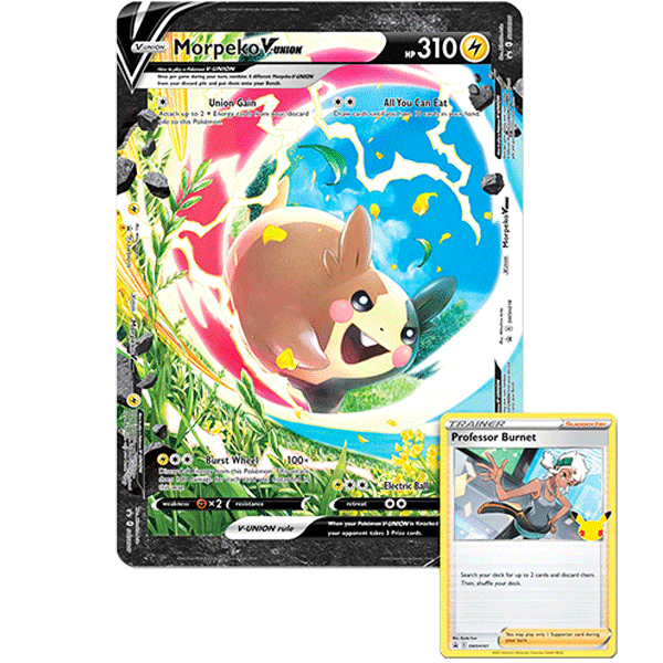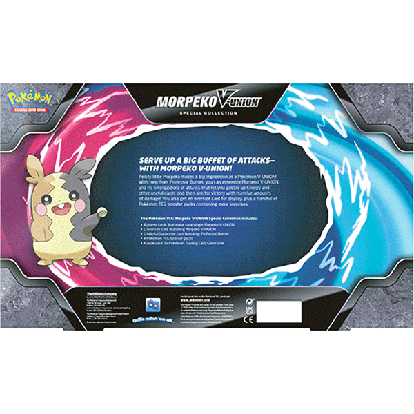 Feisty little Morpeko makes a big impression as a Pokémon V-UNION! With help from Professor Burnet, you can assemble Morpeko V-UNION and its smorgasbord of attacks that let you gobble up Energy and other useful cards, and then aim for victory with massive amounts of damage! You also get an oversize card for display, plus a handful of Pokémon TCG booster packs containing more surprises.