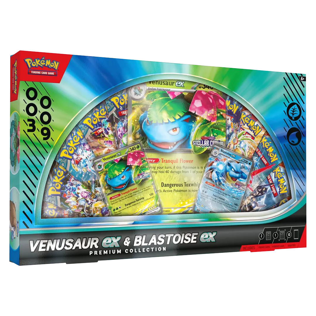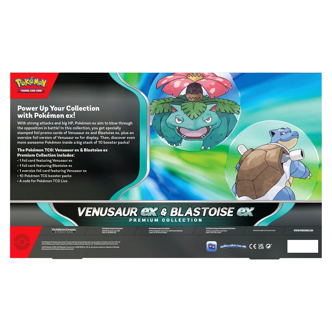 Power Up Your Collection with Pokémon ex! With strong attacks and big HP, Pokémon ex aim to blow through the opposition in battle! In this collection, you get specially stamped foil promo cards of Venusaur ex and Blastoise ex, plus an oversize foil version of Venusaur ex for display. Then, discover even more awesome Pokémon inside a big stack of 10 booster packs!