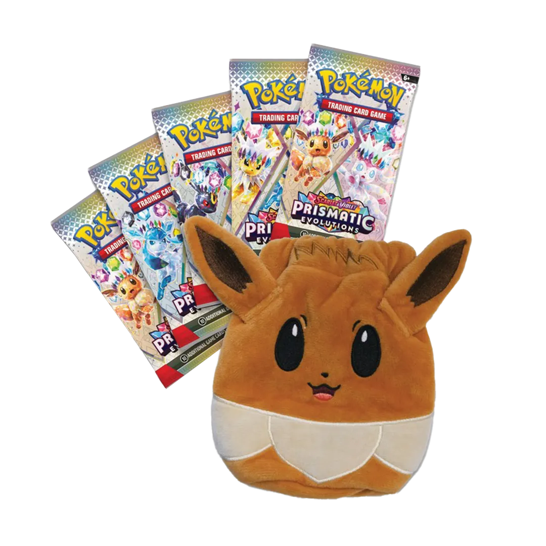 Cute, fuzzy, and full of charm, Eevee can bring a smile to the face of anyone it meets! With the soft accessory pouch in this collection, you can carry Eevee’s enthusiasm with you wherever you go, from Pok mon League to a day out on the town. Eevee’s big ears stand tall for a unique look, and the drawstring on top helps keep your coins and other accessories secure. Also included are booster packs from the special Scarlet & Violet—Prismatic Evolutions expansion, featuring more Pok mon fun inside!