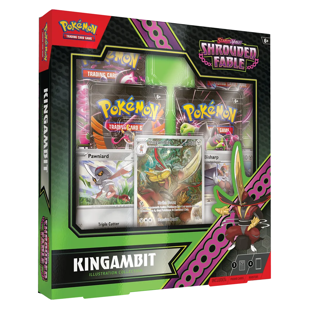 Kingambit overcomes all challengers to become the leader of its own army! With this noble collection, you can add the Big Blade Pokémon to your team as an illustration rare-style promo card, joined by foil cards featuring Pawniard and Bisharp. You’ll also find four booster packs from the special Scarlet & Violet—Shrouded Fable expansion!