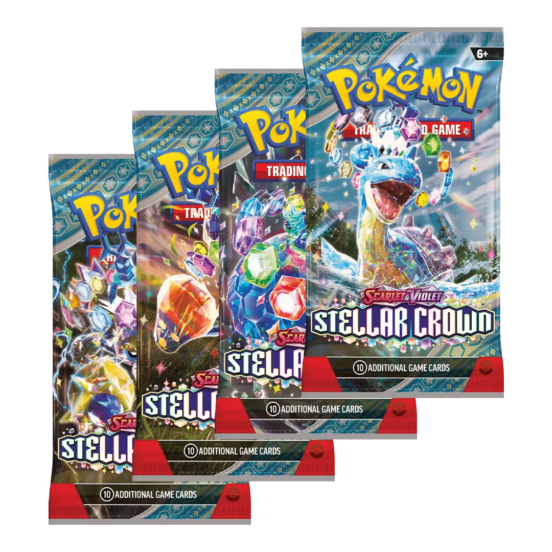 Descend into a world below the surface and discover the true potential of the Terastal phenomenon! The Legendary Pokemon Terapagos takes the throne, joined by Cinderace ex, Lapras ex, and Galvantula ex, all wielding brilliant new powers as Stellar Tera Pokemon ex. The newly discovered Hydrapple ex leads even more Pokemon ex into battle, and ACE SPEC cards continue to shake up the game in the Pokemon TCG: Scarlet & Violet- Stellar Crown expansion! Over 170 cards. More than a dozen new Pokemon ex. More new ACE SPEC cards. More than 20 Trainer cards. More than 30 Pokemon and Trainer cards with special illustrations.