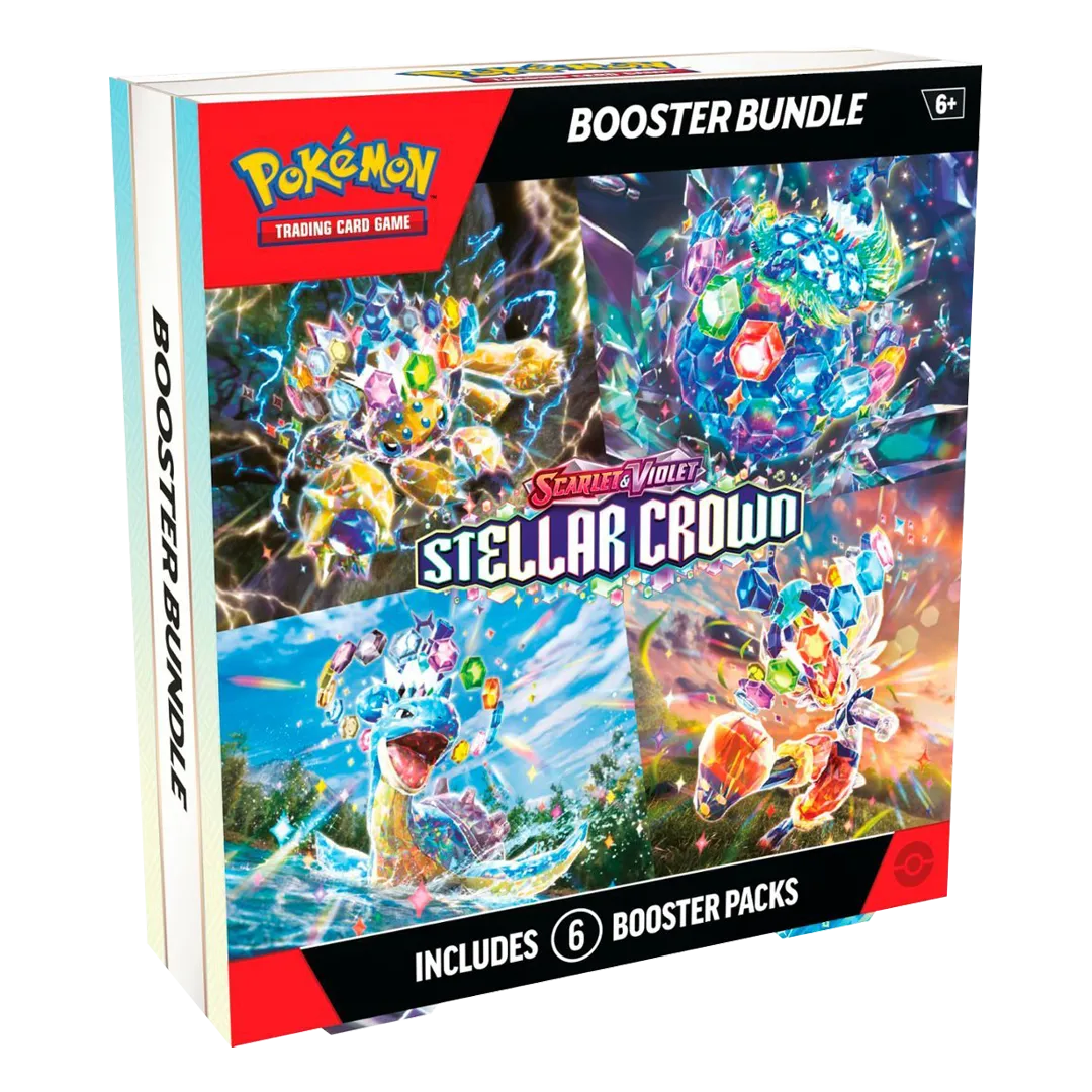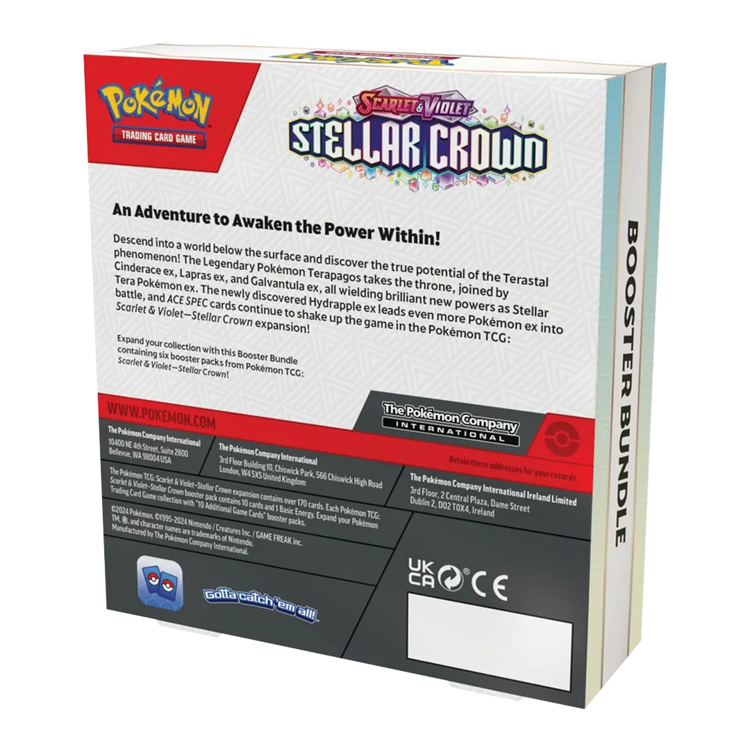 Descend into a world below the surface and discover the true potential of the Terastal phenomenon! The Legendary Pokemon Terapagos takes the throne, joined by Cinderace ex, Lapras ex, and Galvantula ex, all wielding brilliant new powers as Stellar Tera Pokemon ex. The newly discovered Hydrapple ex leads even more Pokemon ex into battle, and ACE SPEC cards continue to shake up the game in the Pokemon TCG: Scarlet & Violet- Stellar Crown expansion!