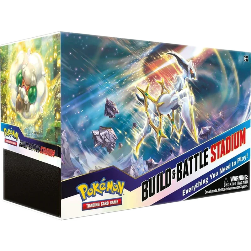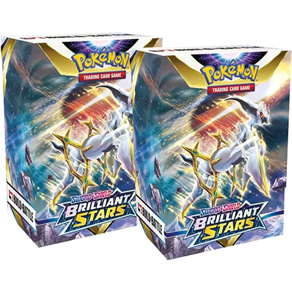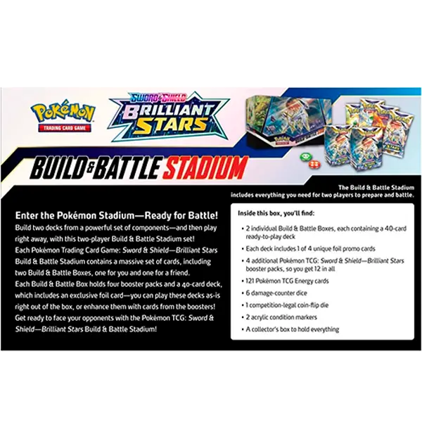 Build two decks from a powerful set of components—and then play right away, with this two-player Build & Battle Stadium set! Each Pok mon Trading Card Game: Sword & Shield—Brilliant Stars Build & Battle Stadium contains a massive set of cards, including two Build & Battle Boxes, one for you and one for a friend. Each Build & Battle Box holds four booster packs and a 40-card deck, which includes an exclusive foil card—you can play these decks as-is right out of the box, or enhance them with cards from the boosters! Get ready to face your opponents with the Pok mon TCG: Sword & Shield—Brilliant Stars Build & Battle Stadium!