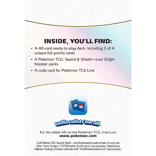 This Build & Battle Box includes a 40-card deck (which contains one of four exclusive foil promo cards) and four booster packs from Pokémon TCG: Sword & Shield—Lost Origin. The deck inside comes ready to play, and you can enhance it with the cards you find in the booster packs!