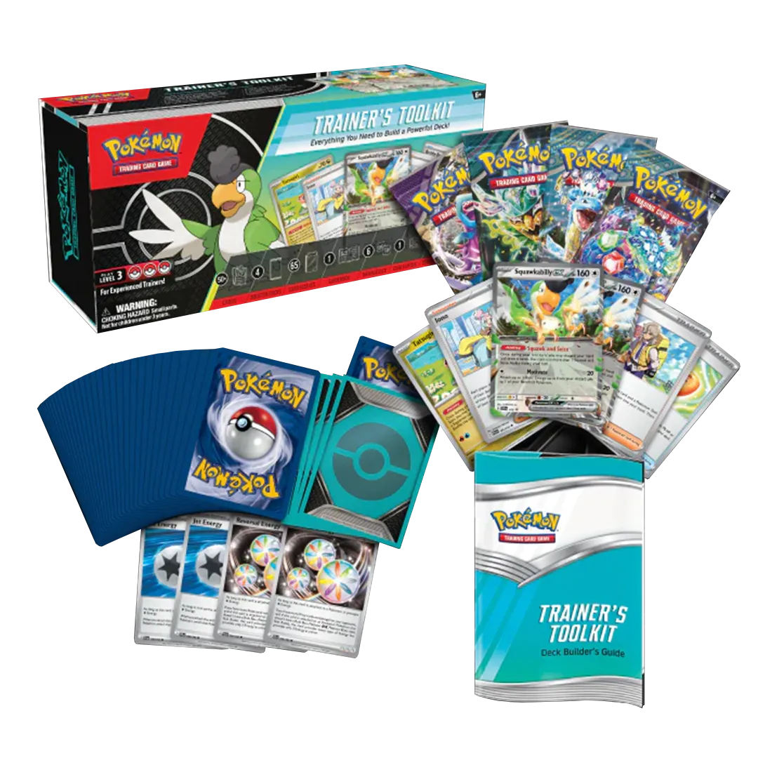 More than 50 useful cards to power up your decks: dozens of Trainer cards, 4 Special Energy cards, and 6 Pokémon, including 2 copies of Squawkabilly ex