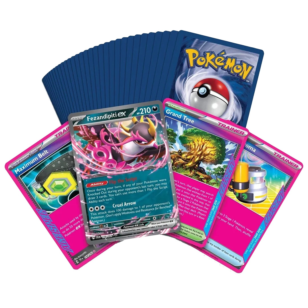 • More than 50 useful cards to power up your decks: dozens of Trainer cards, including 5 promo cards and 3 ACE SPEC cards, plus a copy of Fezandipiti ex