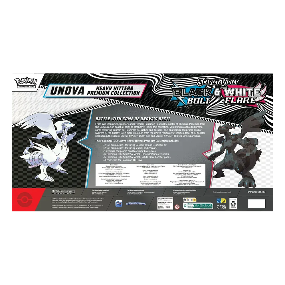 From awe-inspiring Legendary and Mythical Pokémon to a tricky master of illusions, Pokémon from the Unova region boast all sorts of strengths! Inside this collection, you’ll find playable foil promo cards featuring Zekrom ex, Reshiram ex, Victini, and Zoroark, plus an oversize foil promo card of Kyurem ex for display. Even more Pokémon from the Unova region await inside a total of 12 booster packs from the special Scarlet & Violet-Black Bolt and Scarlet & Violet-White Flare expansions.
